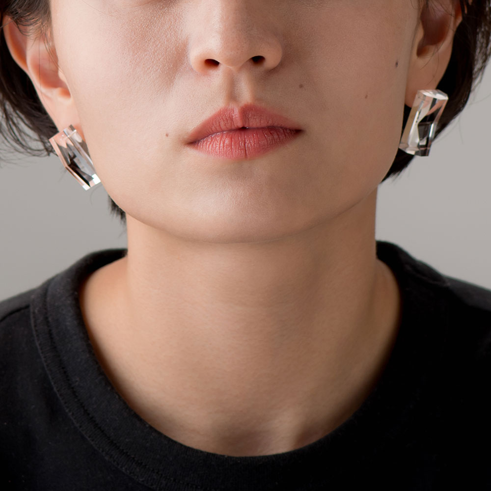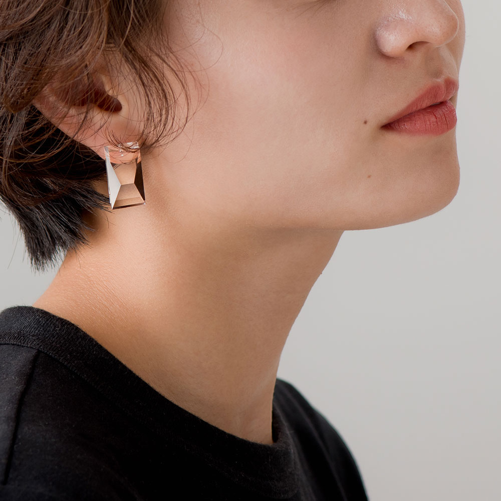 item:CHAMFER LONG EARRING/PIERCE(CLEAR) price:8,000yen+tax brand:NUEN(ヌエン) 見え方にこだわり、比率をどの面も敢えて変えて削り出したアシンメトリーなイヤリング。