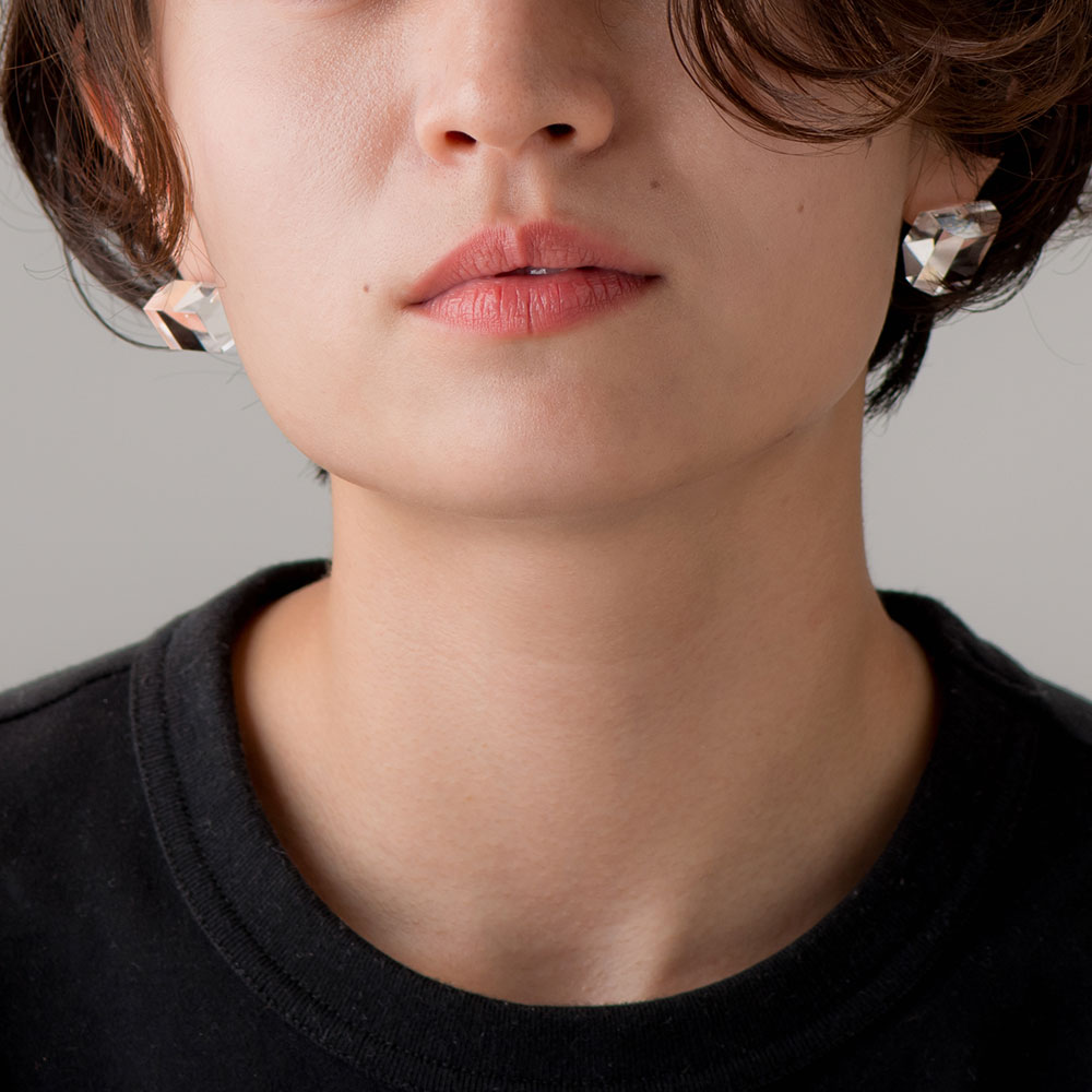 item:CHAMFER SHORT EARRING/PIERCE(CLEAR) price:7,000yen+tax brand:NUEN(ヌエン) 見え方にこだわり、比率をどの面も敢えて変えて削り出したアシンメトリーなイヤリング。